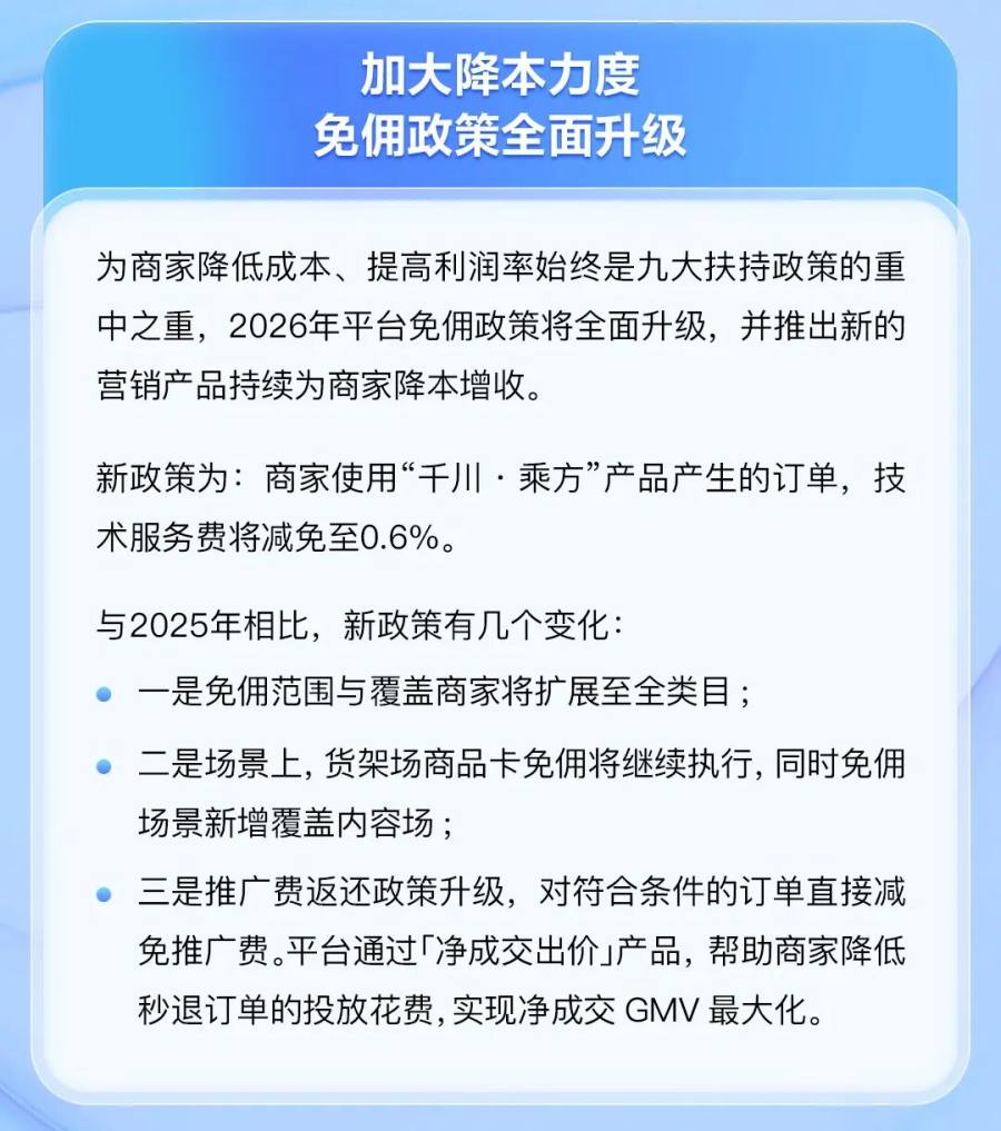 例如,在升级后的免佣政策下,使用“千川·乘方”产品产生的全品类订单,均可享受技术服务费减免至0.6%,免佣政策的适用场景也从货架场商品卡进一步覆盖至内容场。