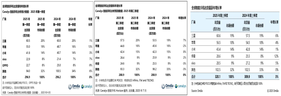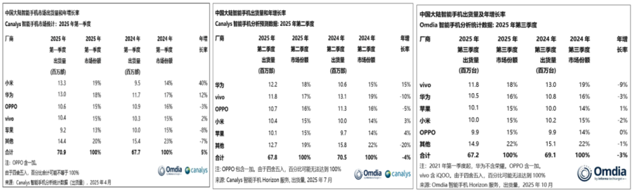 据Omdia数据显示,在国内智能手机市场一季度至三季度的出货量上看,2025年3个季度中并未出现过荣耀身影,反而是OPPO分别以出货量1060万台、1070万台、990万台位列3个季度的两次第三名和第五名,vivo分别以约1040万台、1180万台、1180万台位列3个季度的第四、第二和第一名。