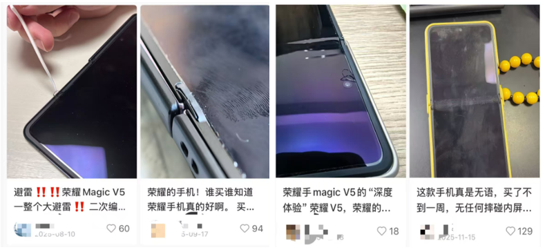 然而,荣耀的折叠屏产品却曝出了品控与售后争议。多位用户在社交媒体反映,荣耀折叠屏手机出现屏幕的系列问题,例如折痕、易损、漏液等等,售后责任判定流程复杂,部分案例中用户需要承担高额维修费用,这造成极大了用户体验感受损。