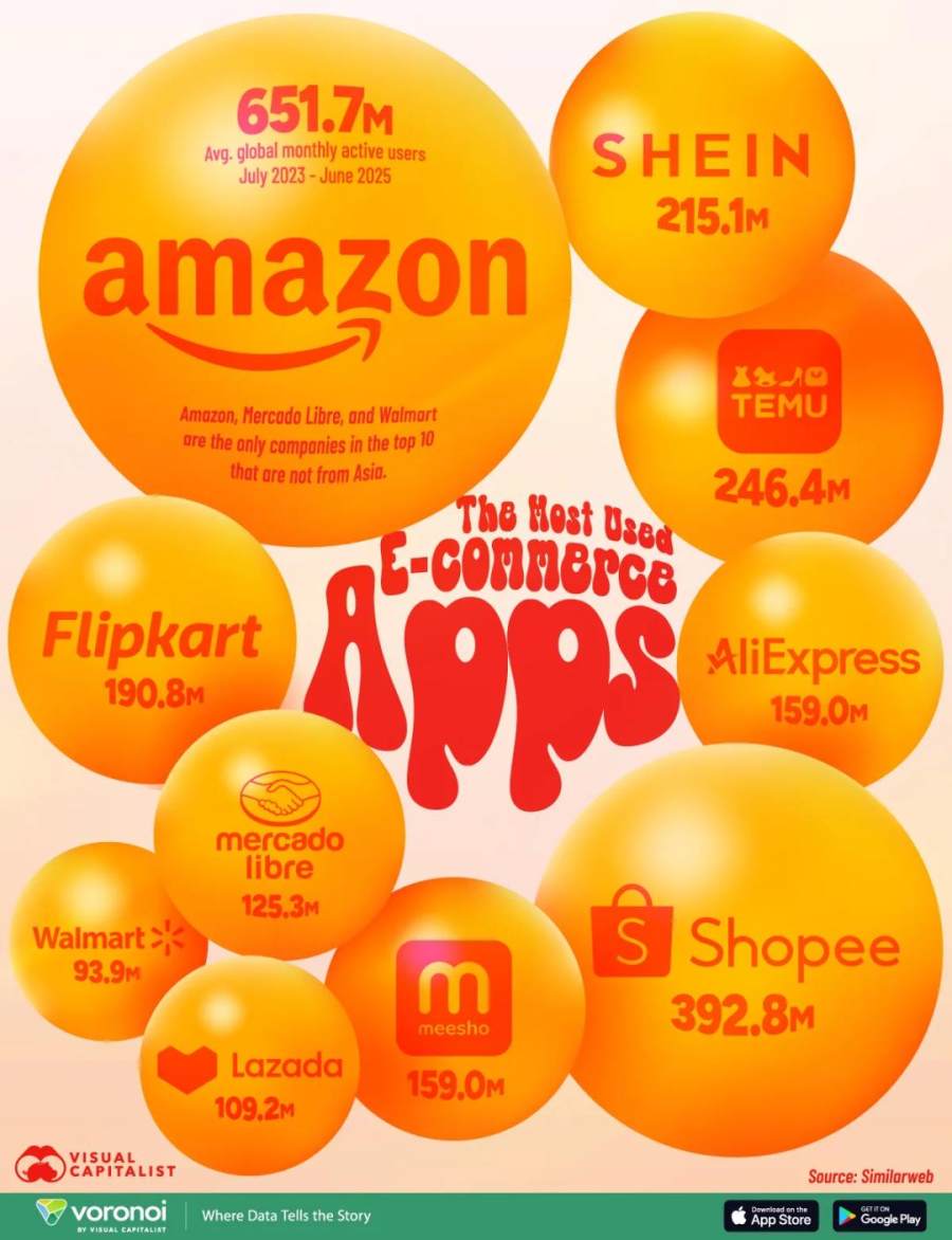 Similarweb数据显示,按月活跃用户数计算,2025年全球前10大电商APP每月合计覆盖用户超20亿人。其中,亚马逊依然称霸,是2025年访问量最高的电商网站。