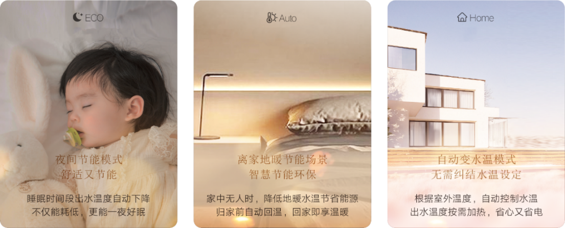 ●自动变水温模式:随室外温度灵活自动调节,用户无需再纠结水温设定,省心又省电。
