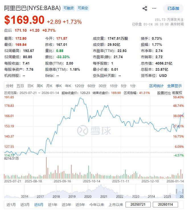截至1月14日收盘,阿里巴巴美股涨1.73%。半年以来,其股价涨幅超过40%,最新市值4056亿美元(约合人民币2.8万亿元)。