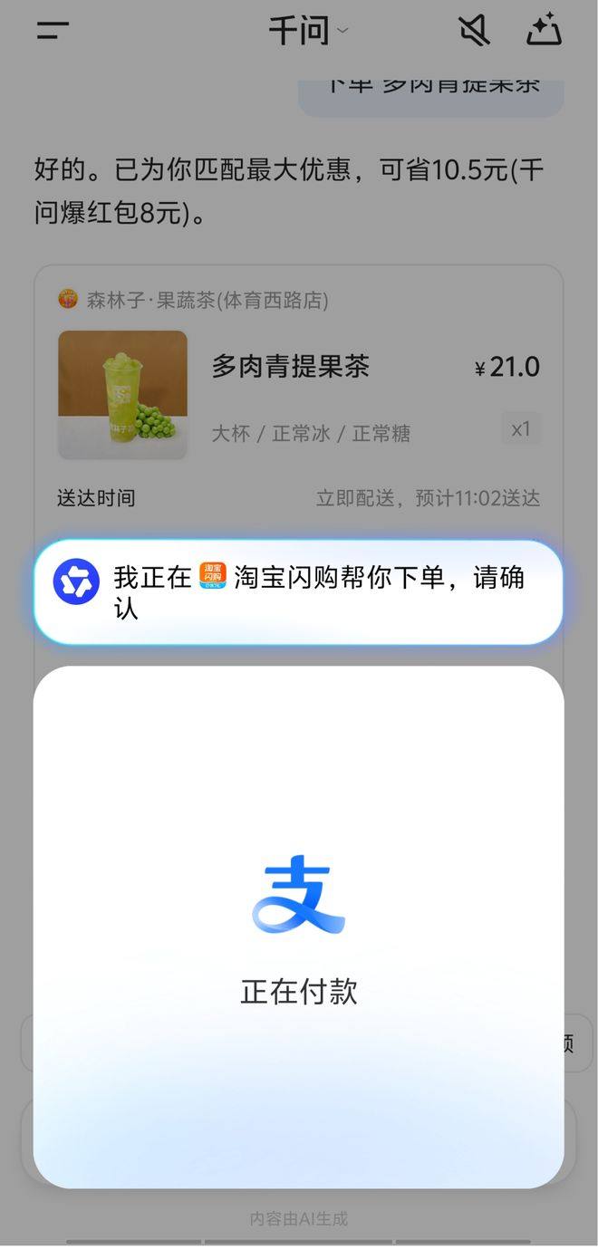 这背后是千问与淘宝闪购、原生AI支付能力“AI付”的系统级打通。