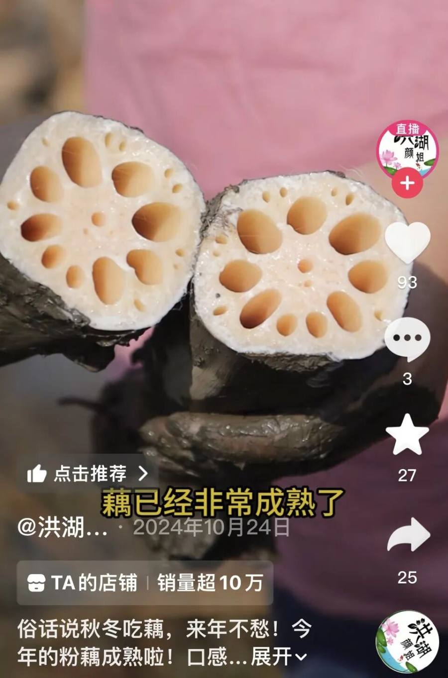 来自湖北洪湖的“颜姐”,在儿子“小陈”的镜头里勤恳地“挖藕”。齐腰深的淤泥、沾满泥点的橡胶服、弯腰十分钟取出三四节完整粉藕……爱吃藕的消费者从这些真实劳作的场景里,了解莲藕是如何从田间走向餐桌,在收获农耕知识的同时,也增加了对食材来源的信任。