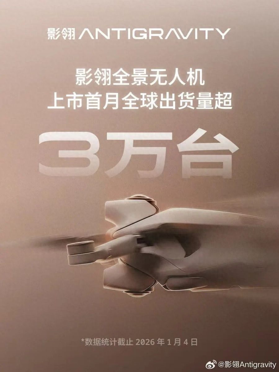 1月13日,影石旗下无人机品牌影翎发布了Antigravity A1上市1个月后的战报,全球出货量突破3万台。