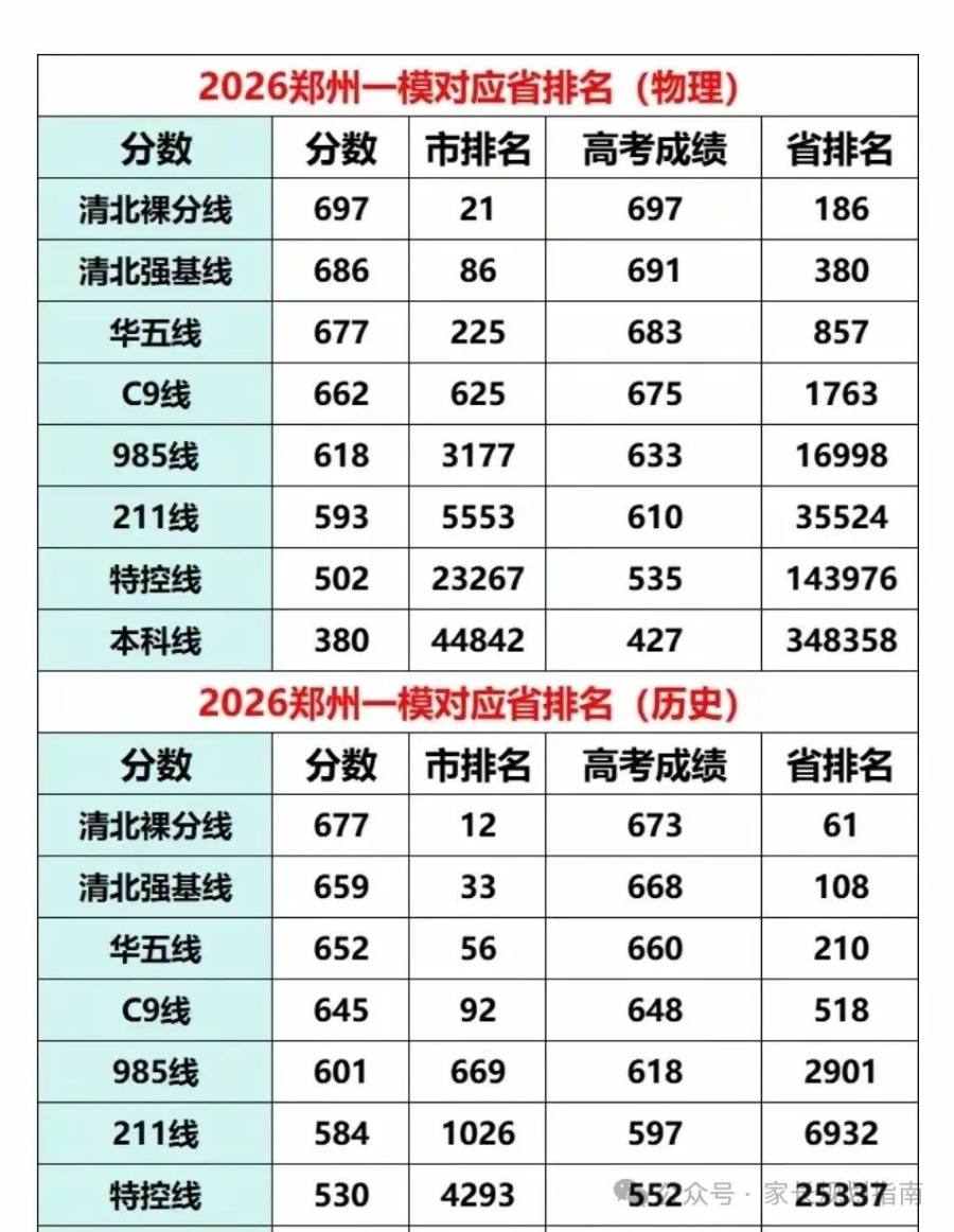 本次一模各批次分数线存在不同版本。以流传较广的版本二为例,物理方向清北裸分线为697分,对应市排名21名;985线为618分,对应市排名3177名;历史方向清北裸分线为677分,对应市排名12名;985线为601分,对应市排名669名。