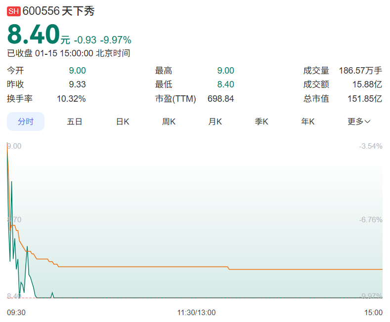 上市初期的2020年8月,天下秀盘中一度创下24.6元的高点。然而,随后天下秀股价开启震荡下行。1月15日,天下秀触及跌停,截至收盘,报8.4元/股,较24.6元/股的高点下跌约65.32%,总市值151.85亿元,较上市当天的近400亿元,蒸发超200亿元。
