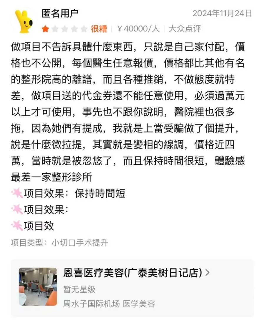 更离谱的是,院内“顾客”不少是拿提成的医托,一唱一和把消费者架在手术台上。高价、低质、信息不透明,加上情绪绑架式推销,让大连恩喜医美成为不少求美者口中“体验感最差”的整形诊所。