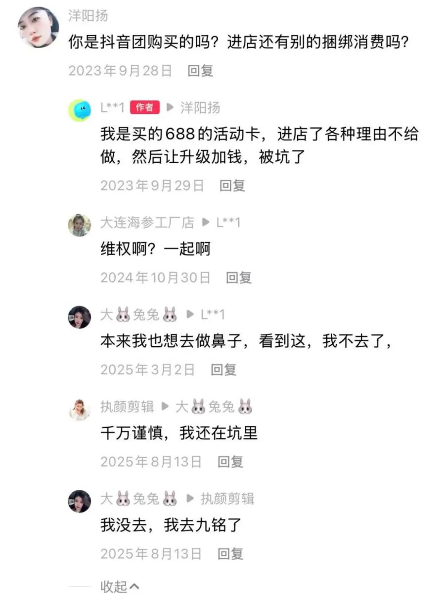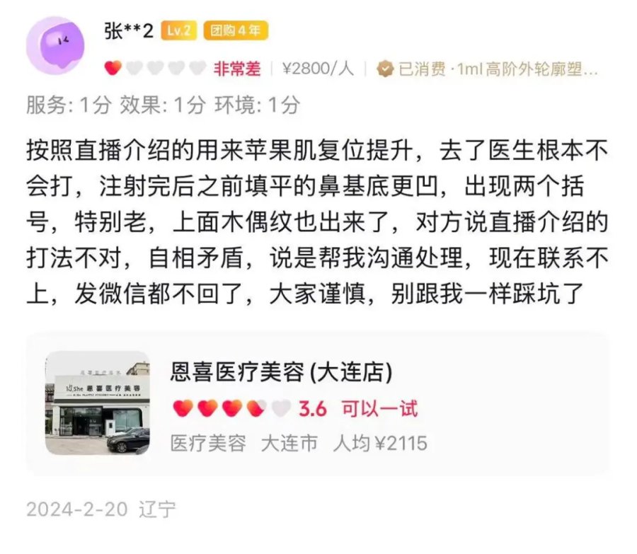 打开抖音,相关的吐槽视频更是数不胜数。一位抖音用户亲身经历后,在评论区中无奈地表示:“一开始是冲着大连恩喜直播承诺的“苹果肌复位提升”去的,结果医生根本不会同款打法,胡乱注射后鼻基底反而塌陷出两道“括号纹”,木偶纹也被拉出来,瞬间显老十岁。