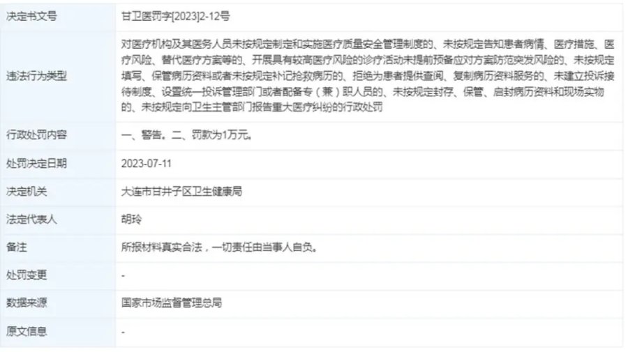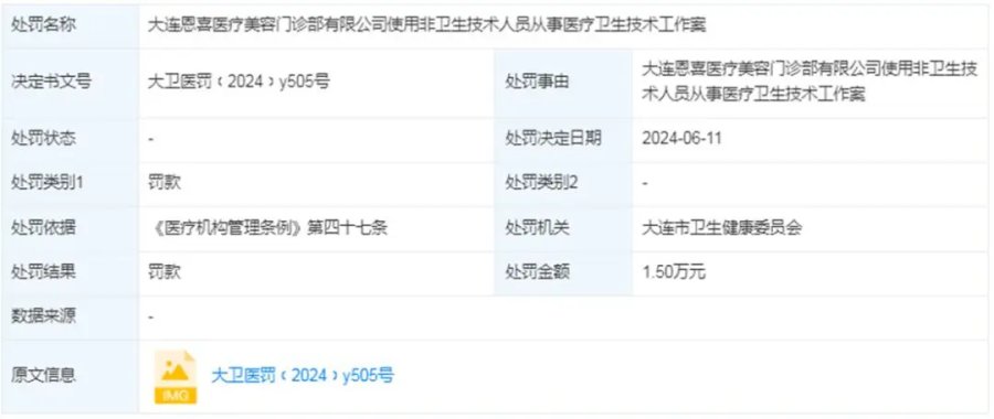 仅仅一年之后,2024 年6月11日,大连恩喜医美居然使用非卫生技术人员从事医疗卫生技术工作,被相关部门罚款15000元。
