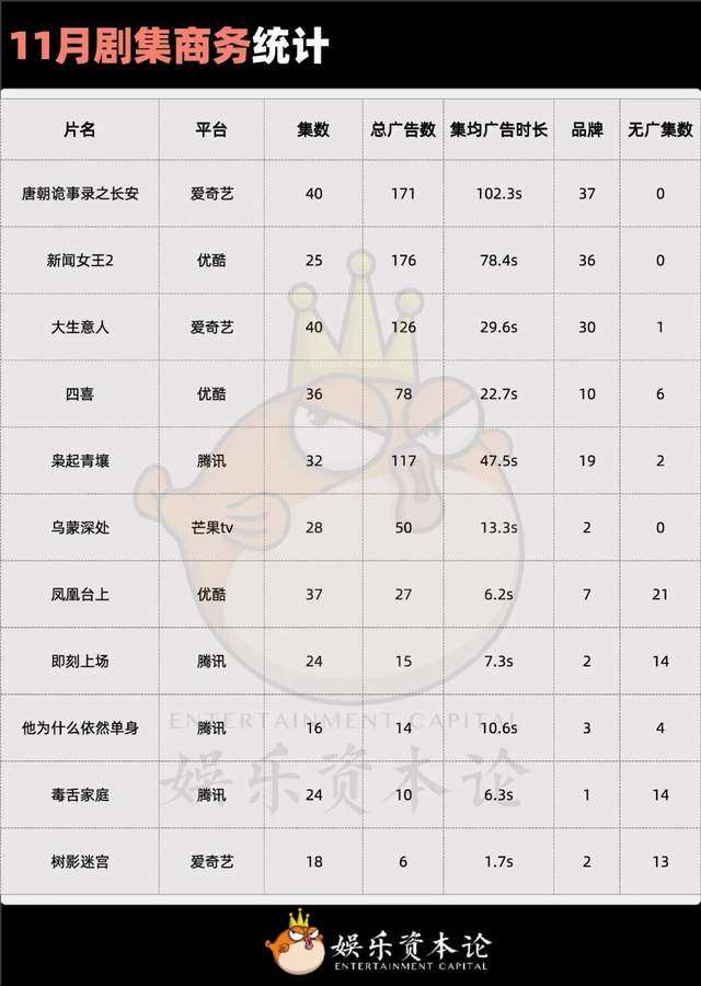 到了十一月剧集招商市场每况愈下,广告投放收缩的态势更为明显,全集有广率降低到27%的冰点。尽管《唐朝诡事录之长安》依托前作奠定的IP热度,《新闻女王2》凭借职场题材的稀缺性和前作的高口碑,分别拿下171个、176个广告数量,集均广告时长更是达到102.3秒和78.4秒的好成绩,却依旧难以带动11月整体的广告市场。半数以上的剧集仅有个位数的品牌合作,甚至无法达到《唐朝诡事录之长安》品牌数量的一半。大量腰部剧集陷入“无人问津”的招商真空状态,充分暴露了广告资本在市场低迷期“倾向头部集中、对中小项目犹豫”的避险逻辑。
