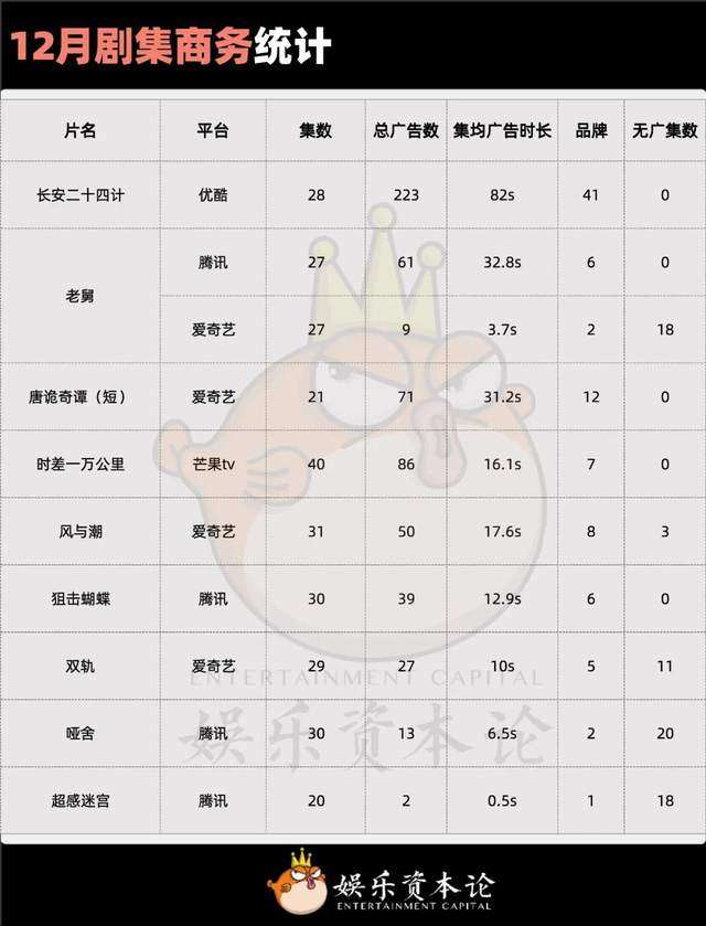 十二月播出的《长安二十四计》在男主角演员成毅的商务加持下,凭借精良的制作、紧凑的剧情的和宏大的场景,在和央视、优酷网台同播获得了不错的收视成绩,更在招商成绩上实现突破:以223个广告数量、41个品牌合作拿下2025年优酷广告年冠。尽管品牌在合作上仍保持相对冷静的态度,未出现大规模投放合作的现象,但《狙击蝴蝶》《双轨》等多部剧集凭借稳定的收视率、良好的口碑及差异化的内容表达,成功吸引了部分品牌的长期合作,带动全集有广率提升至56%,让招商市场状况逐渐回暖。