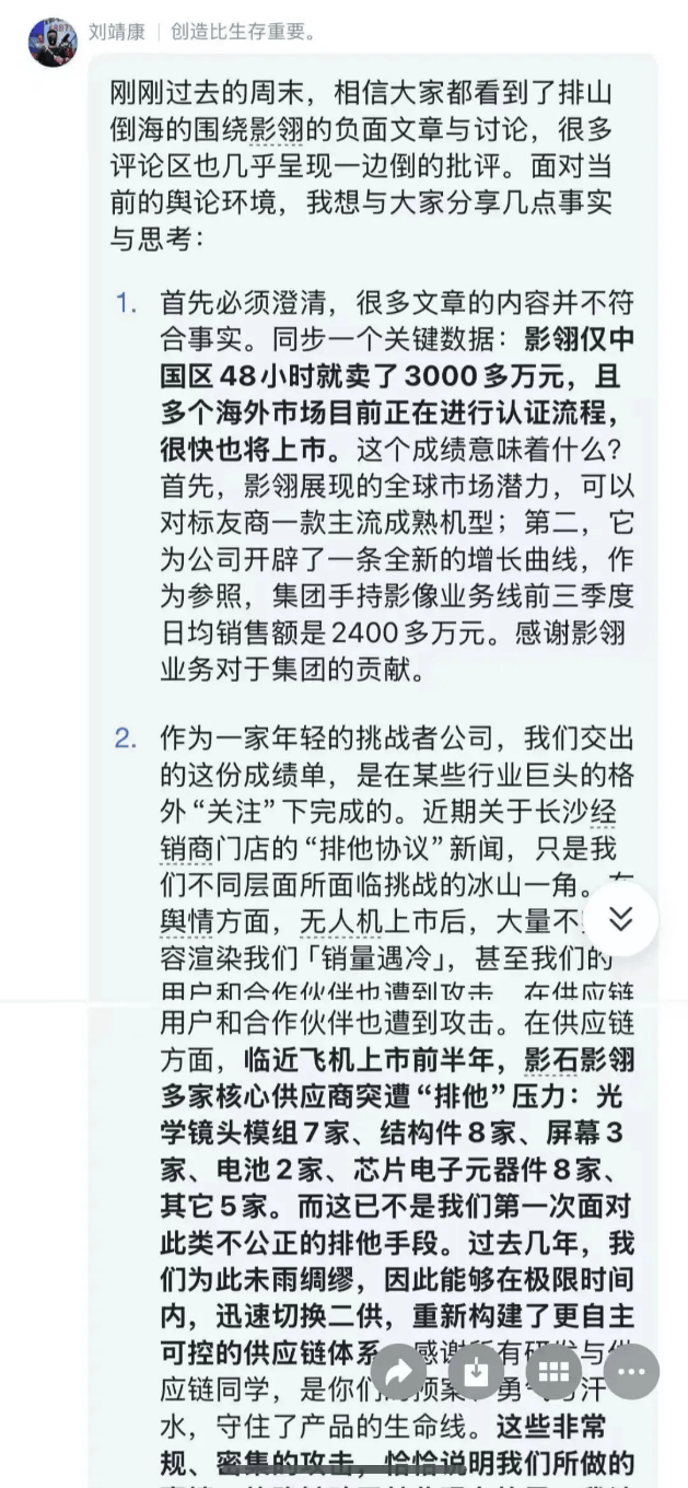 显然,彼时影翎A1销售遇冷的舆论风波,刘靖康选择将其归结为大疆的攻击。