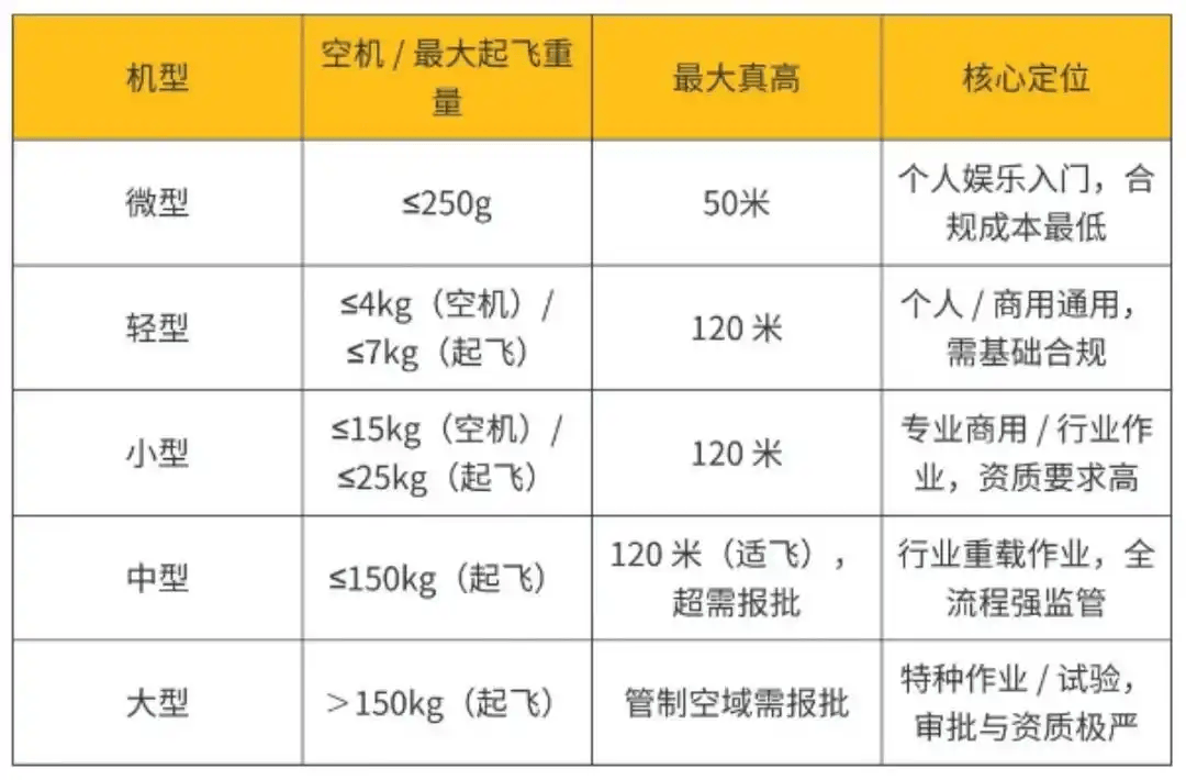 新规明确了无人机“黑飞”行为的法律处罚依据,根据无人机的空机重量和最大起飞重量,将其分为微型、轻型、小型、中型、大型五类,合规要求逐级提高。
