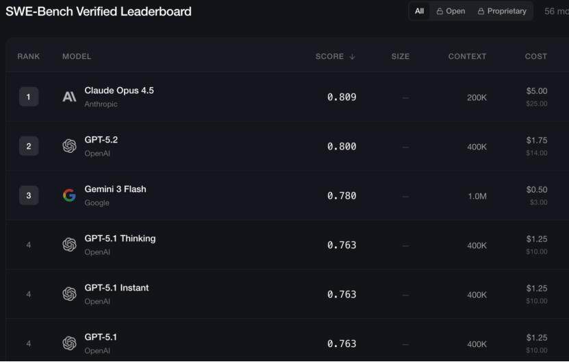 SWE-Bench Verified排名前五的模型来自Anthropic、OpenAI、谷歌。