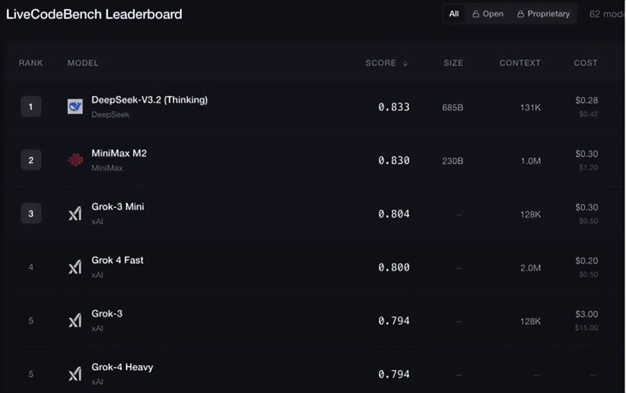 在Live Code Bench中,xAI表现较好,Grok-3 Mini、Grok 4 Fast、Grok-3分别排在第三、四、五位。这是一个全面且无污染的大型代码语言模型评估基准。它持续从编程竞赛中收集新问题,以便评估模型训练截止后发布的未见过的问题。