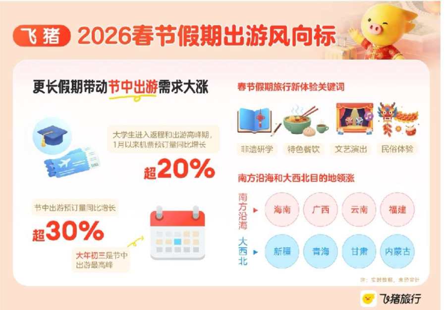 距离“史上最长春节假期”不足一个月,旅行市场正在升温。飞猪《2026年春节假期出游风向标》显示,随着国内高校陆续放假,学生迎来返程和出游高峰期,1月以来大学生机票预订量同比去年增长超20%;跨境游需求爆发,近两周出境游服务预订量同比增长近40%,入境游机票预订量更是增长超4倍。更长的假期还带来节中出游需求的激增。