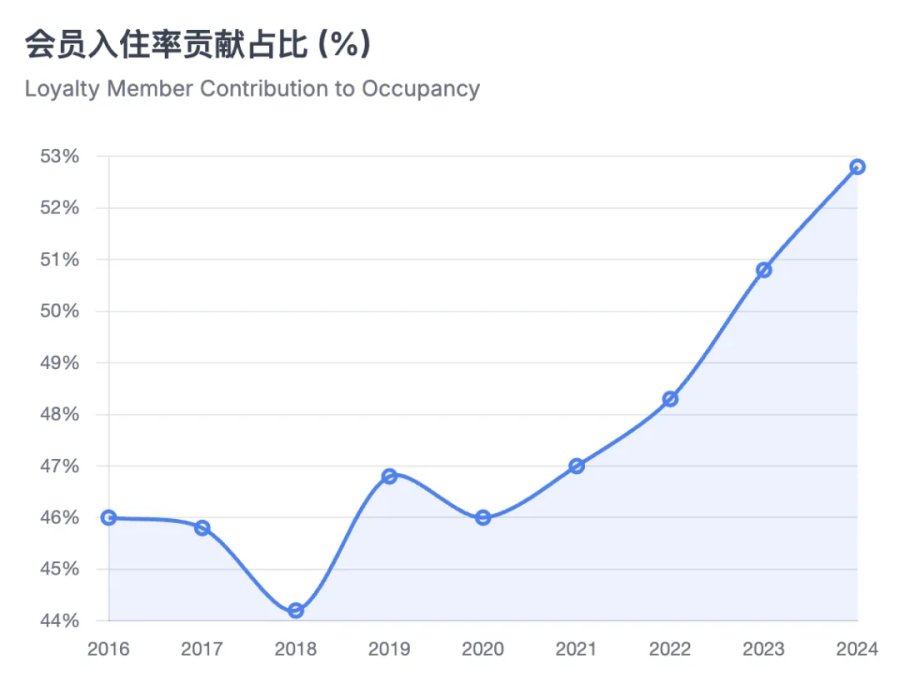 基于各大酒店集团公开数据统计,2024年忠诚度会员贡献了酒店已售客房总数的52.8%,高频会员贡献了约58.4%的间夜量。
