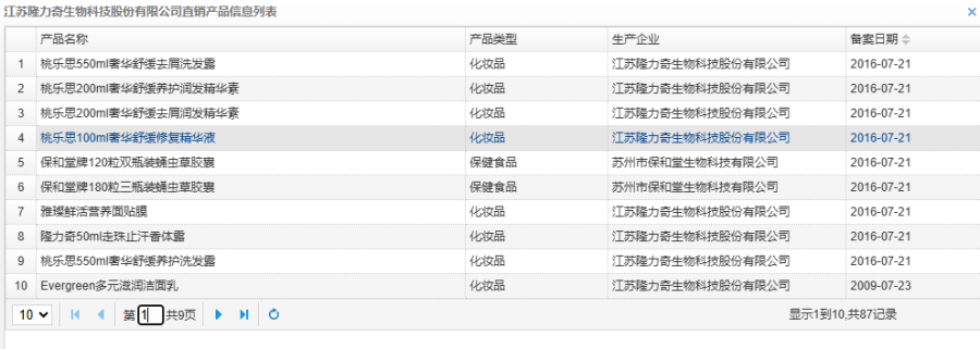 而根据商务部直销行业管理信息系统公示信息,江苏隆力奇生物科技股份有限公司持有的直销牌照,批准范围明确限定于化妆品、保健食品、保洁用品三大类别,涵盖共计87种具体产品。