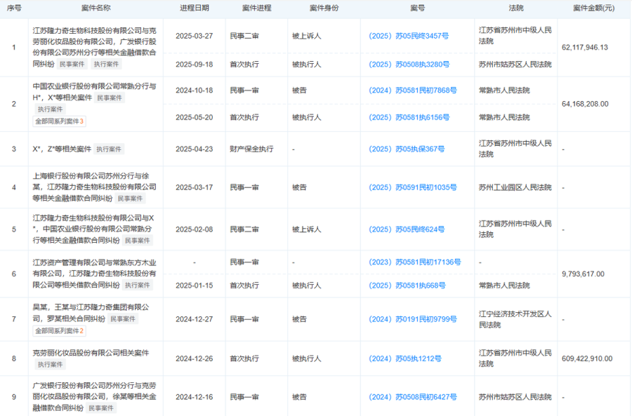 值得一提的是,隆力奇集团66条司法案件中,多条涉及金融借款合同纠纷。此前,隆力奇集团还曾9次被列为被执行人,被执行总金额达8.79亿元。