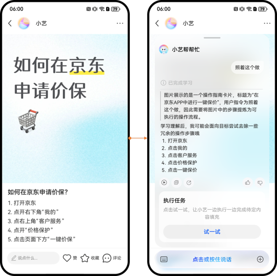 华为小艺能直接“看到屏幕”,并且随意调用手机系统内的APP。具体来说,用户可以直接对小艺说用某应用做某事,或者让小艺找攻略并“照着做”。在常规场景下,用户可以“使唤”小艺在各种购物软件买东西,也可以让小艺自主订票或下载电视剧。如果用户遇到自己不会操作的场景,可以提供一份操作步骤(或者让小艺自己去网上学),然后小艺就能自主学会并执行。