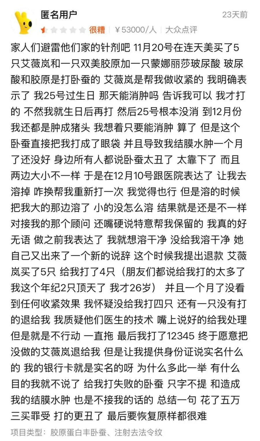 就这样,消费者花了五万三,不仅没有变美,反而陷入了无尽的痛苦和烦恼之中。