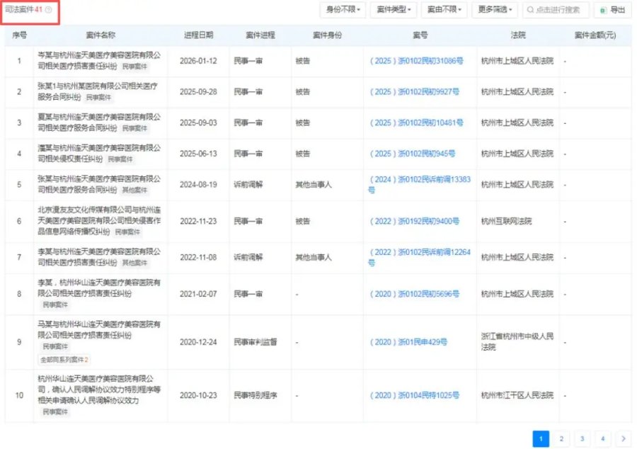 除了行政处罚,杭州连天美的司法纠纷案件数量也相当惊人。据天眼查显示,截止2025年年末,该机构涉及的司法案件多达数41条,其中不乏医疗损害责任纠纷、服务合同违约、消费者维权诉讼等。大量诉讼的背后,也进一步说明了杭州连天美问题的普遍性,并非个例“运气差”。