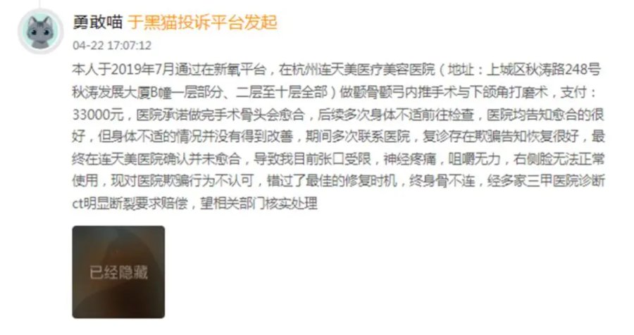 早在2019年,就有消费者通过新氧花3.3万元在杭州连天美做颧骨颧弓内推+下颌角打磨,术后张口受限、神经疼痛,多次复诊却被一句“骨头愈合很好”打发。最终该院亲口承认“并未愈合”,却已错过最佳修复窗口,造成终身骨不连、右侧脸功能报废。