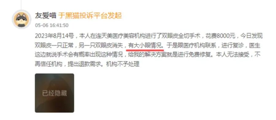在2023年,同样有消费者就在黑猫平台上爆料,8月14日在杭州连天美花8000元做全切双眼皮,术后一只眼皮消失,出现明显大小眼。更过分的,术后院方仅一句“手术概率问题”就想用免费修复打发,对顾客要求退款却被冷处理。