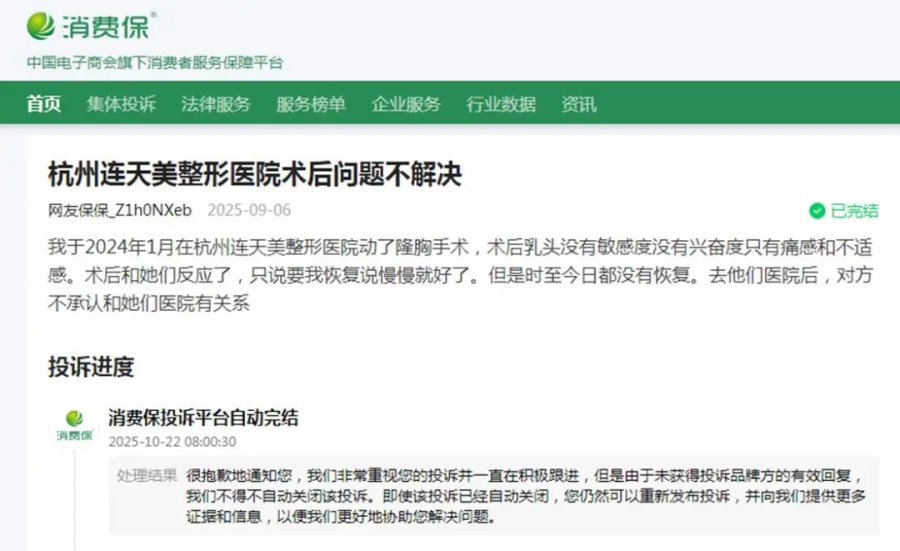 2024年1月,有消费者在连天美做隆胸手术后乳头完全失去敏感度,只剩持续疼痛,多次回院仅被一句“慢慢恢复”打发。但半年多过去仍无好转,院方竟直接否认与手术有关,再次把医疗风险甩给患者,毫无同理心可言。