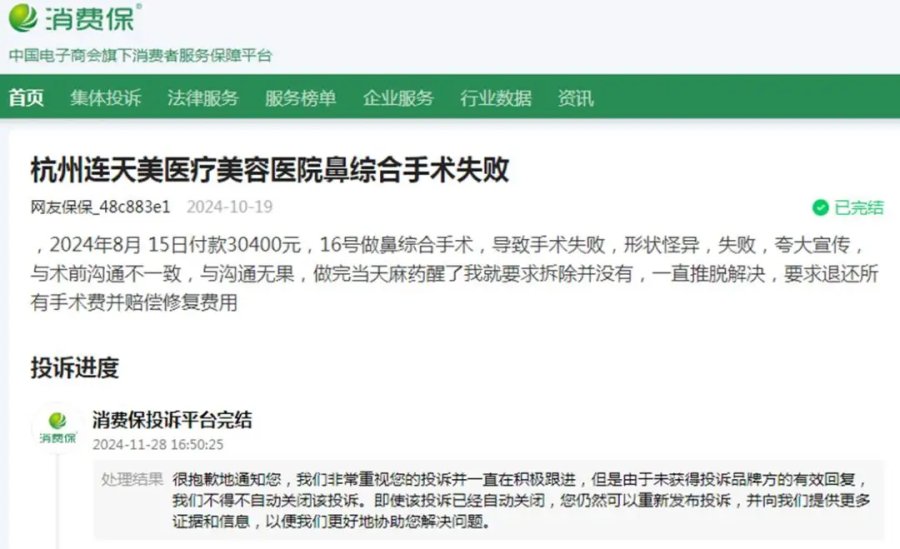 2024年8月,也有消费者无奈的表示,15日付款30400元,16日于连天美接受鼻综合,术后即刻发现形状怪异、与术前承诺完全不符,当天麻药一过就要求拆除却被再三拖延,至今沟通无果。