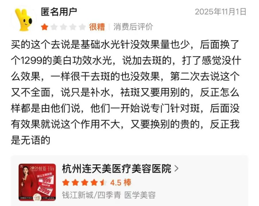 先是以基础水光收了钱却毫无效果,后升级的1299元美白祛斑水光,打完依旧干燥斑点纹丝不动,而工作人员更是理直气壮,直言“这只是补水,祛斑得再买更贵项目”,让人非常无语。