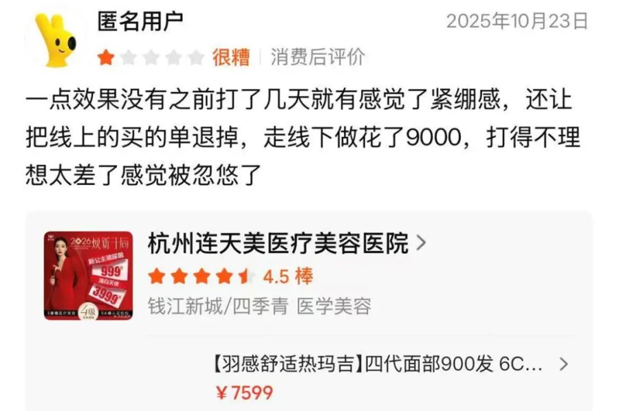 在各大消费平台上,有人晒术前术后对比,有人直接上医院门头堵门直播,评论区成了受害者联盟,杭州连天美想甩都甩不掉。