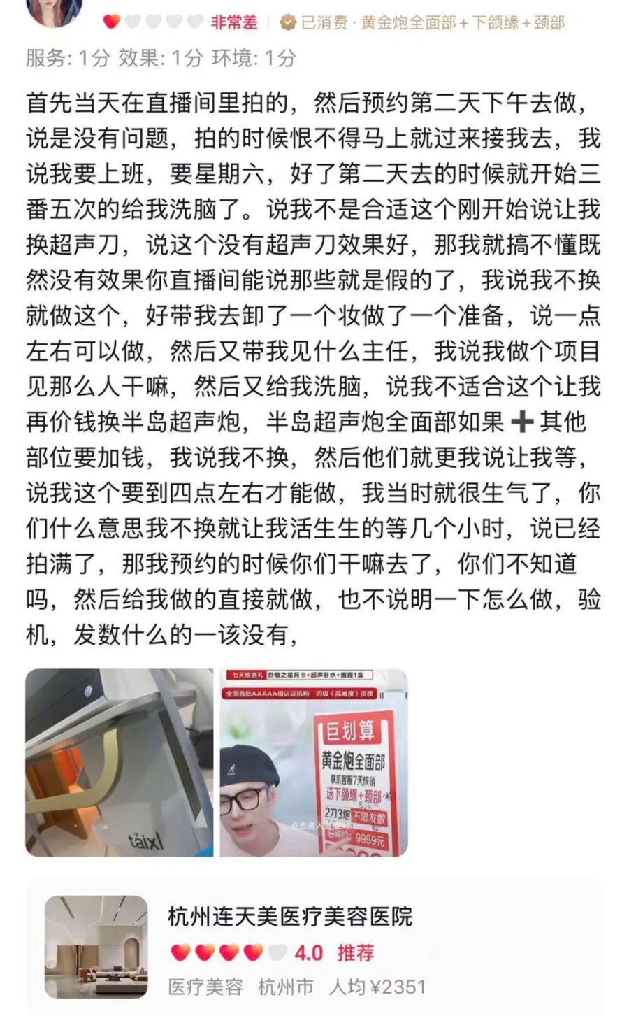 抖音直播间里,杭州连天美把低价项目吹得天花乱坠,秒拍秒约。消费者一到院,立马被轮番洗脑,先让改高价超声刀,再升级半岛超声炮,不换就故意拖延排期,把“已约满”当武器,逼顾客加钱。