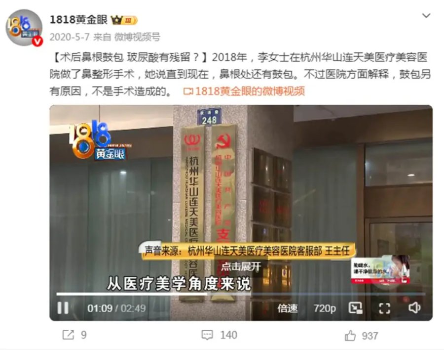 2018年,李女士在杭州华山连天美做鼻整形后鼻根鼓包至今未消。当朱女士提出退还全部手术费用时,院方却称“与手术无关”,把疑似玻尿酸残留或操作失误的问题推得一干二净。