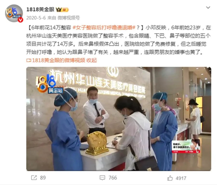 更令人震惊的是,浙江本地知名民生节目《1818黄金眼》曾多次报道杭州连天美的医疗事故案例。