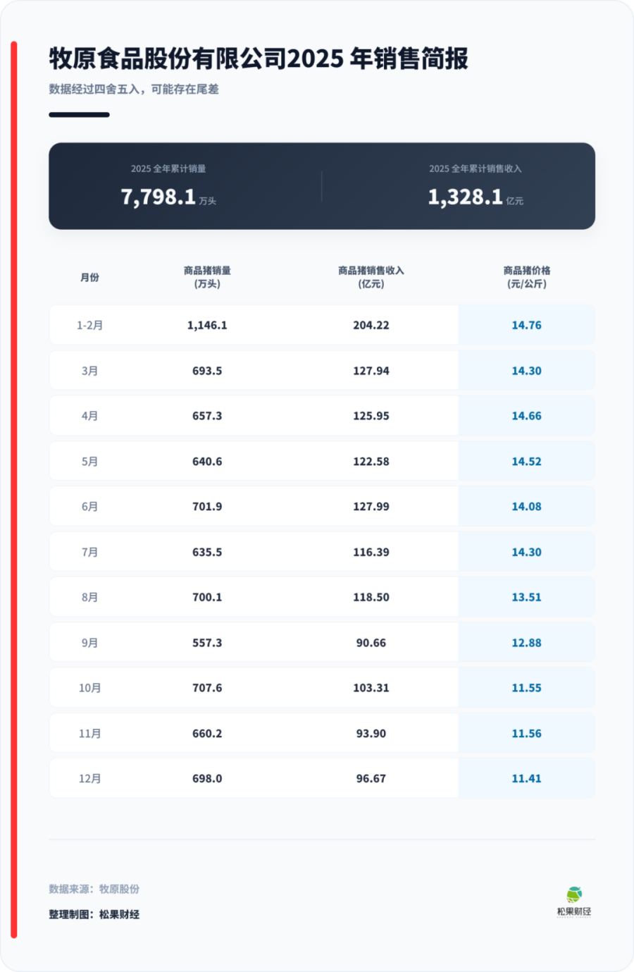 牧原的基本功如何?往前倒推一年,2024年行业的基数不低,有龙头喜提历史最好表现,比如温氏股份当年首次实现营收破千亿。而到2025年,猪价同比下降,“越卖越亏”的现象抬头,不少企业便扛不住了。