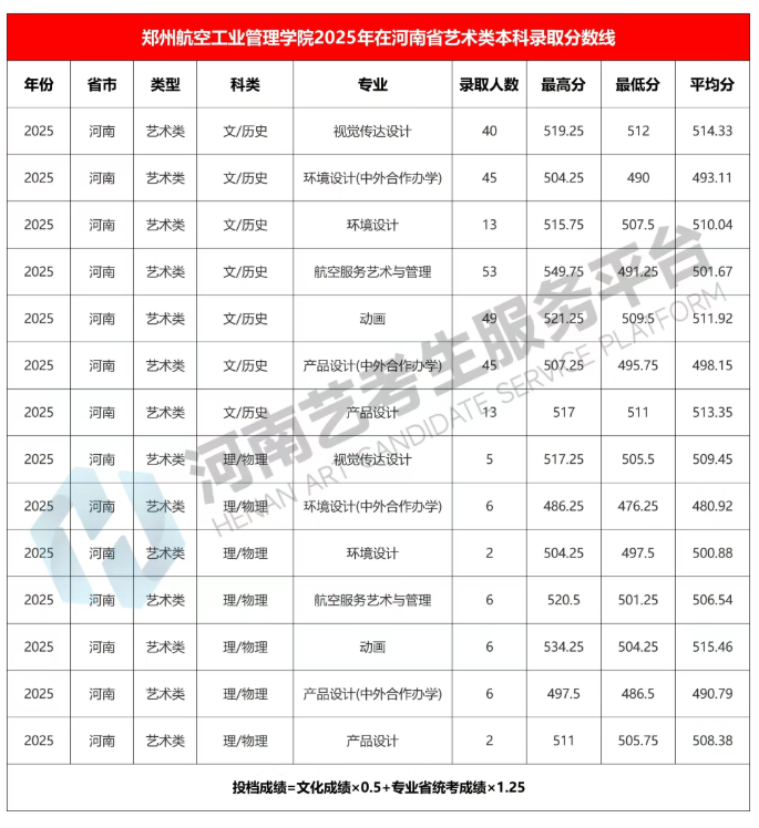 郑州航空工业管理学院2025年在河南省艺术类本科录取分数线