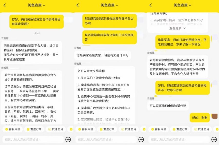 那么,这些合作机构是否具备鉴定资质?贝多商业&贝多财经联系了闲鱼人工客服,对方承诺鉴别机构均有商誉,但对于“能否出具带有公章的检测报告”这一问题,客服并没有给出正面答复。