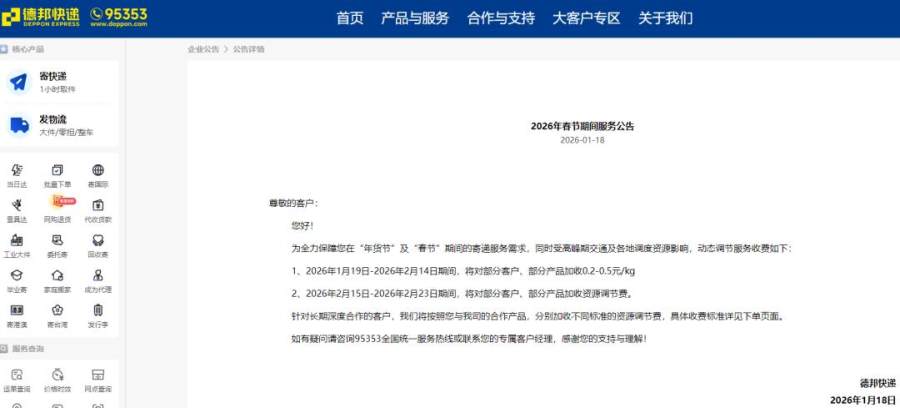 德邦和顺丰一样,采取了分阶段收费的策略。具体而言,2026年1月19日-2026年2月14日期间,将对部分客户、部分产品加收0.2-0.5元/kg;2026年2月15日-2026年2月23日期间,将对部分客户、部分产品加收资源调节费。