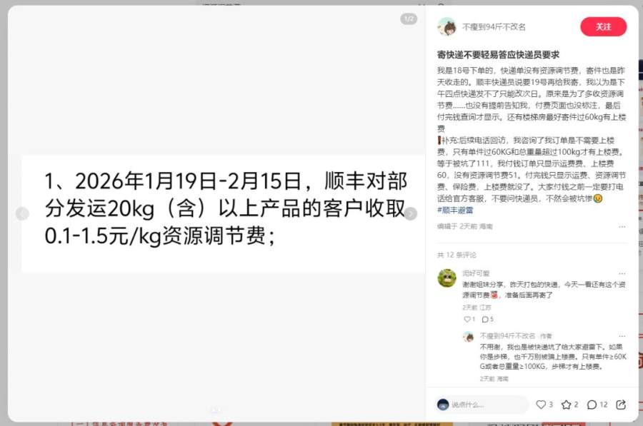 2026年1月16日,顺丰在《2026年春节期间服务公告》中明确表示:2026年1月19日-2月15日,顺丰对部分发运20kg(含)以上产品的客户收取0.1-1.5元/kg资源调节费;2026年2月16日-2月23日春节假期期间,顺丰对寄递服务加收资源调节费。