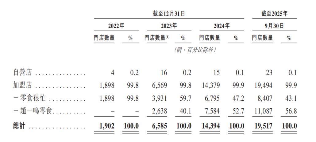 核心是加盟,而不是直营。鸣鸣很忙在招股书中反复强调,业务发展“依赖于与认同我们价值、共同发展品牌及门店网络的加盟商合作”。在往绩记录期间,门店网络几乎完全由加盟店构成,公司自营店仅为战略性用途,不承担主要规模。