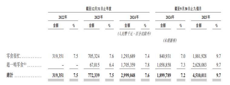 招股书数据显示,截至2022年底,“零食很忙”门店为1902家;通过收购赵一鸣后,“零食很忙+赵一鸣”合计门店数在2023年底达到6585家;到2024年底,这一数字进一步扩张到1.4万家;截至2025年9月30日,两大品牌合计门店达到1.9万家,其中零食很忙8419家,赵一鸣1.1万家。