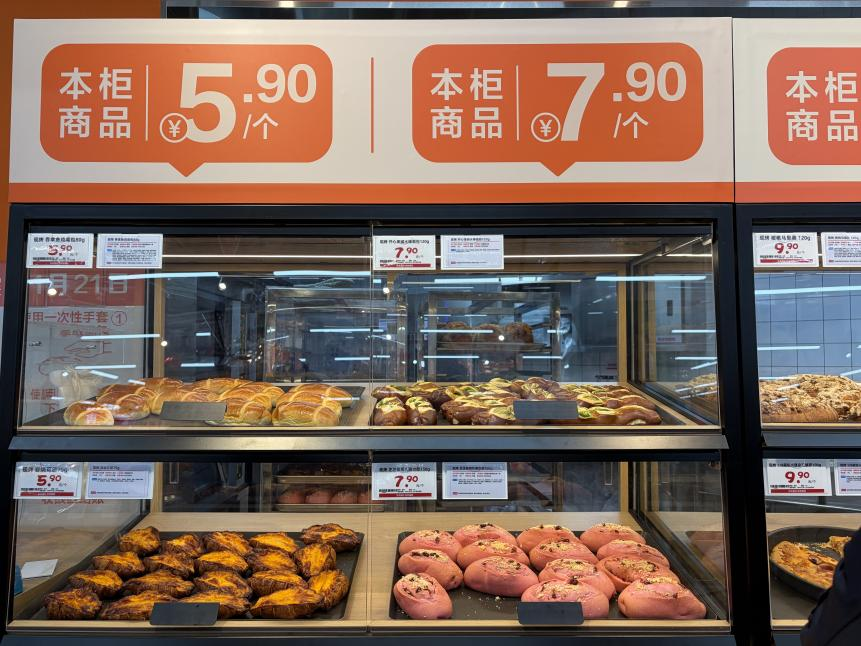 在烘焙与熟食区,调整更为显著。由于当地烘焙品类竞争激烈、需求旺盛,所以华南区域的门店在烘焙品类上进行了扩容,据壹览商业观察,与华东地区的门店相比,至少增加了超10款SKU,价格集中在5.9-9.9元区间。