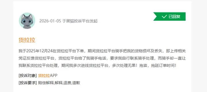 笔者在黑猫投诉平台上,以货拉拉为关键词搜索,共出现96597条投诉,主要内容包括消费者投诉货物被损坏、投诉无人处理、货品丢失无人赔付等等。