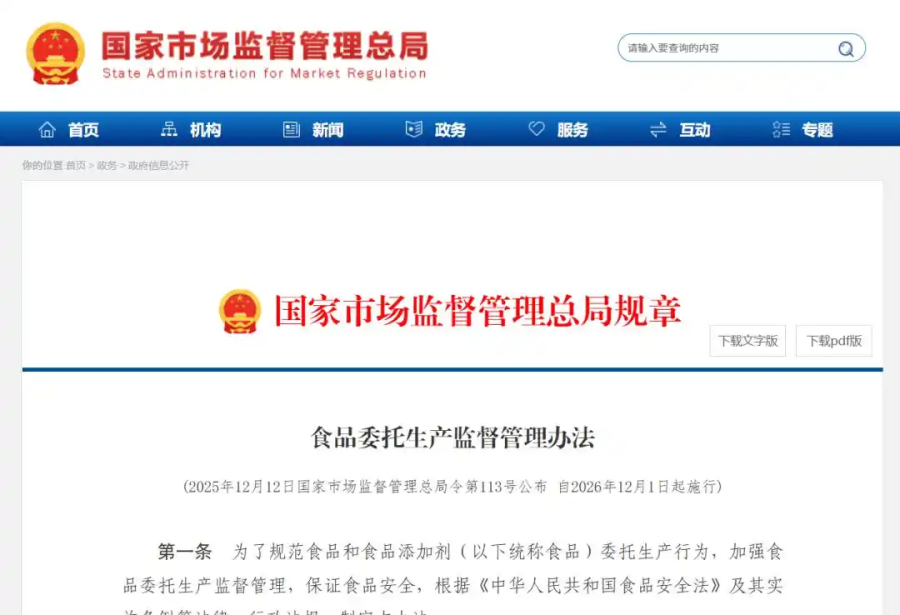 日前,市场监管总局新出台《食品委托生产监督管理办法》(以下简称《办法》),该法现在已经正式实施,这份被业界称为“最严委托生产管理办法”的新规,对委托双方责任划分、生产过程监督、产品标识等做出全面规定。