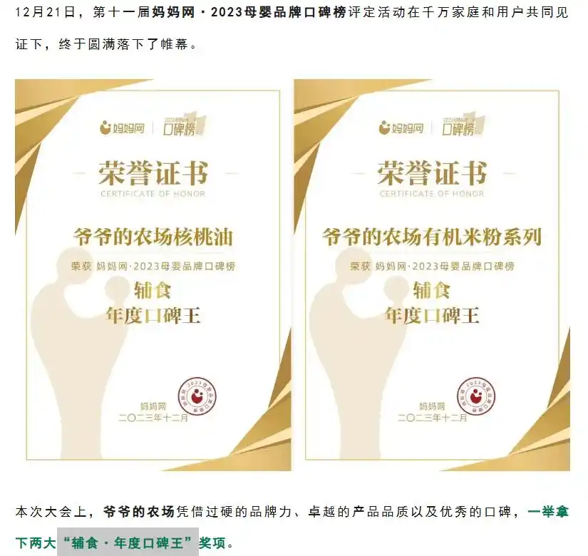 网红的另一面,自爷爷的农场成立以来,长期霸榜在妈妈网的母婴品牌口碑榜中,曾多次斩获奖项,而爷爷的农场则将这些获奖广泛用于自身宣传渠道及媒体推广。