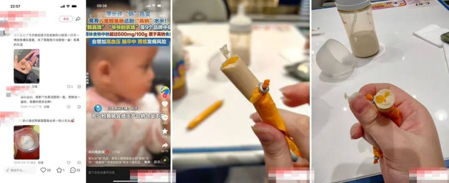 通过小红书搜索个人(用户)的笔记中,有不少当因产品因质量问题被用户发帖曝光。小红书平台有一消费者投诉,根据其晒出的对话内容显,娃娃在吃其芝士玉料鳕鱼肠时吃出了塑料状的异物,在其小红书下跟贴的更是有晒出爷爷的农场小软包中出现线头,小袋粉状物里倒出来一粒小石子……