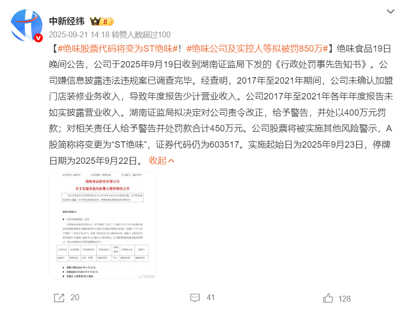 同时,公司被上海证券交易所公开谴责,公司股票被实施其他风险警示,股票简称由“绝味食品”变为“ST绝味”。