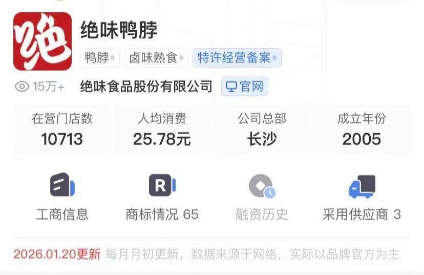 但如今,它的加盟店正在持续减少。自门店数量在2023年历史性地达到15950家后,绝味食品此后再未在财报中披露具体的门店数量,窄门餐眼的数据显示,截至2025年9月中旬,绝味鸭脖的在营门店数量为10725家,到2026年1月20日,进一步缩水至10713家,较2023年高峰时期的15950家已减少5237家。